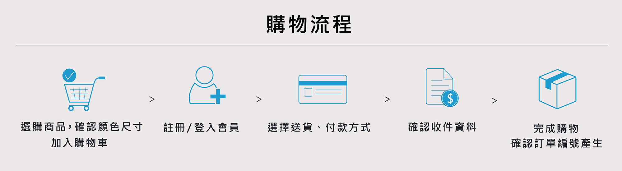 將喜愛的商品加入購物車→進入購物車點選前往結帳→登入/註冊會員→選擇結帳方式→確認收件資料→完成購物並確認訂單編號產生