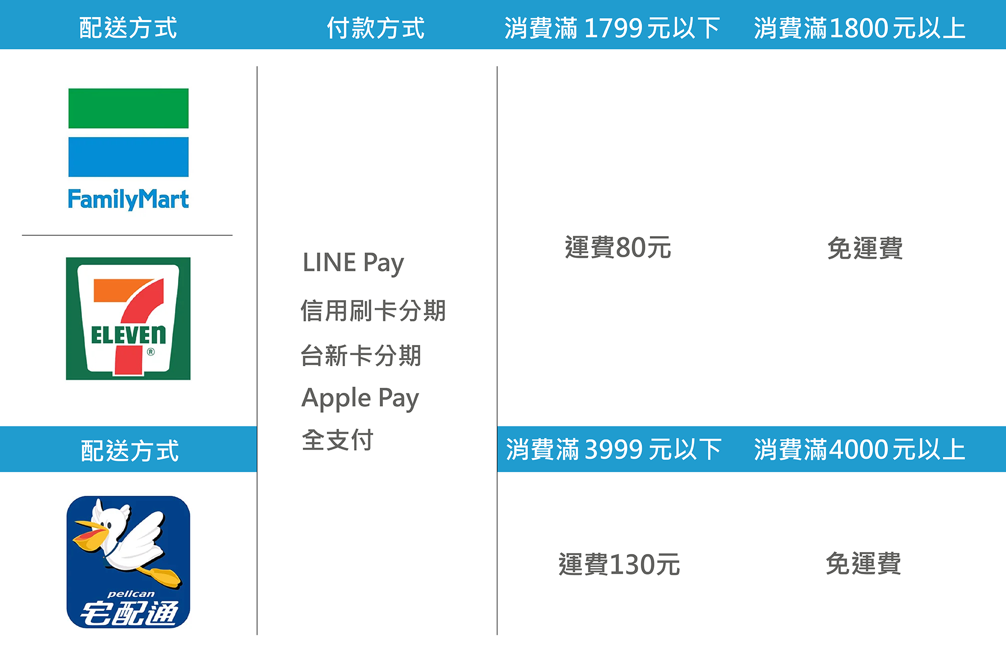 目前提供 「LINE Pay」、「台新信用卡刷卡分期」、「全支付」、「信用刷卡付款」等付款方式。(信用卡僅限台灣地區發行之VISA、Master Card、JCB信用卡 )。