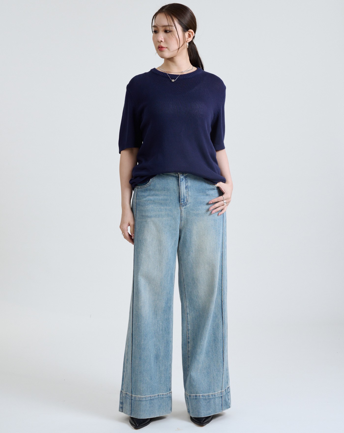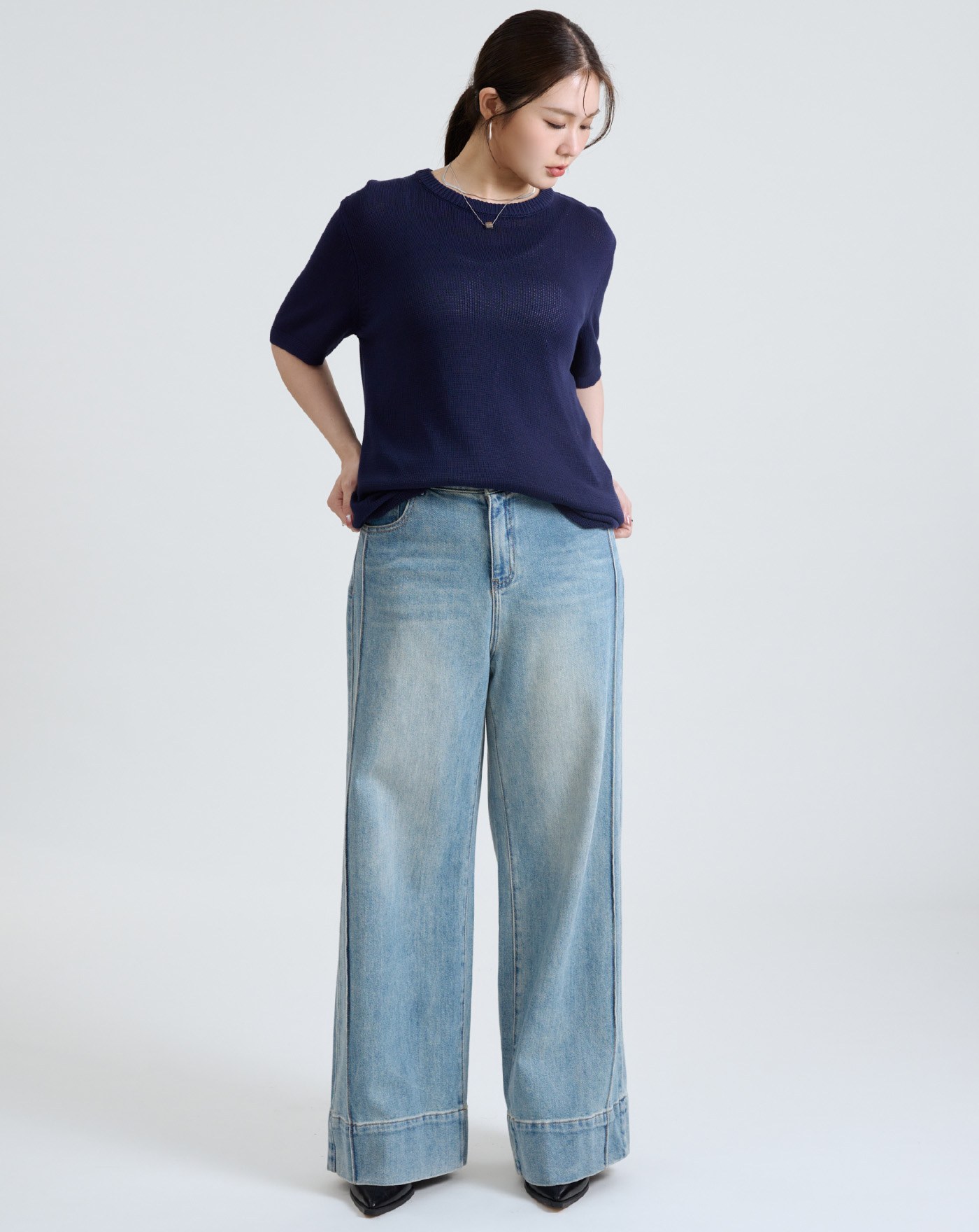 收小腹顯瘦車線刷色牛仔寬褲