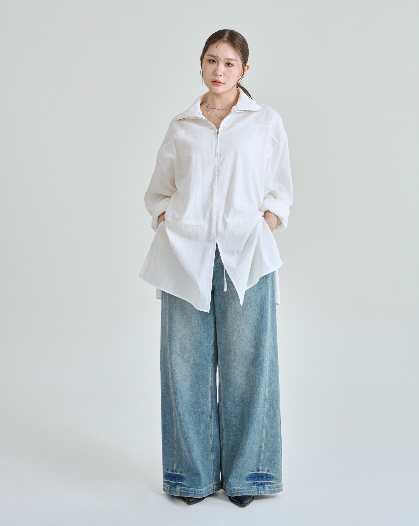 顯瘦抓褶刷色牛仔寬褲