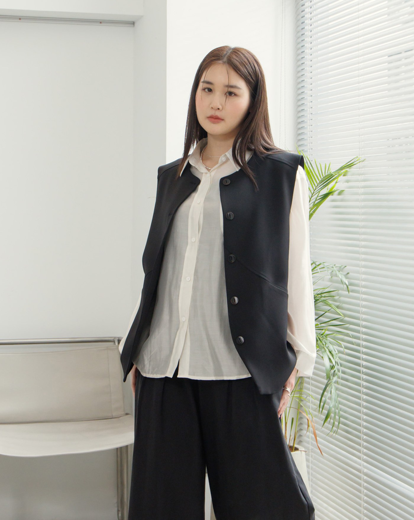 細節口袋剪接無領西裝背心