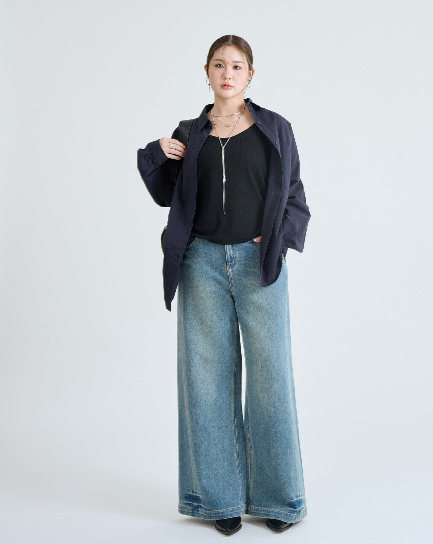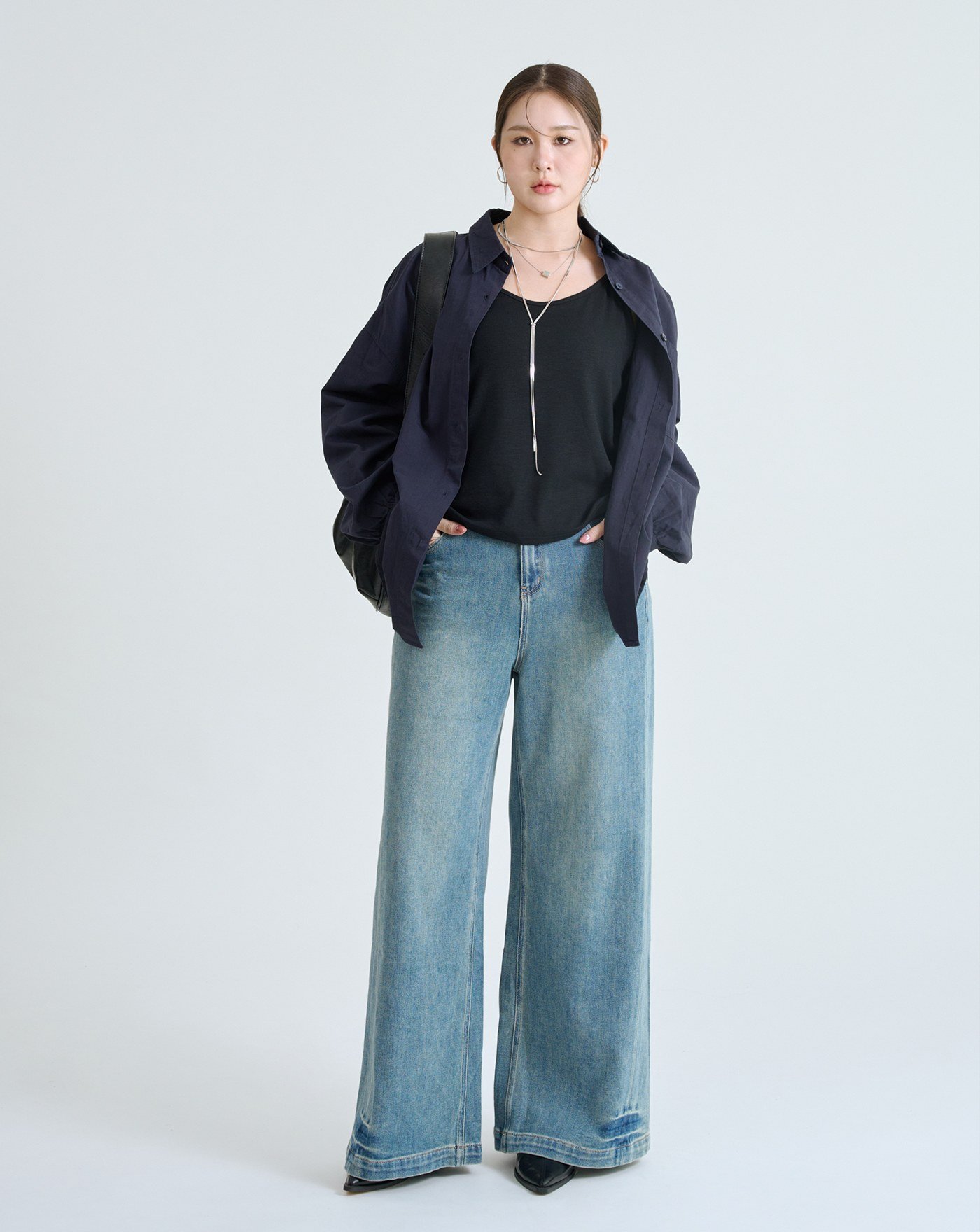 收小腹顯瘦車線刷色牛仔寬褲
