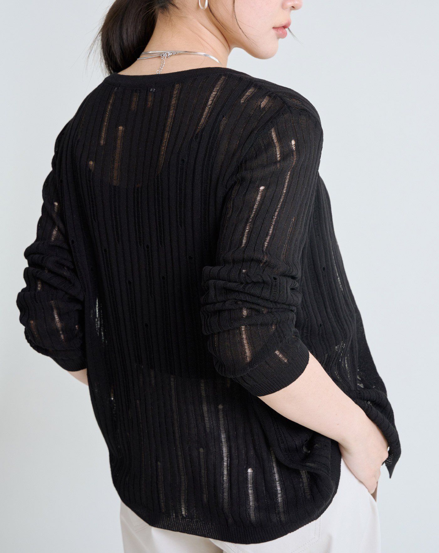 V領鏤空短袖針織上衣